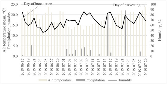 The meteorological conditions during spring wheat inoculation with Fusarium strains and grain threshing were described using data from the Dotnuva Hydrometeorological station, Kedainiai district, Lithuania (Figure 6). Climatic conditions mainly influenced plant pathogenic fungi. A wet and warm environment during wheat flowering and seed filling increased the risk of FHB disease.