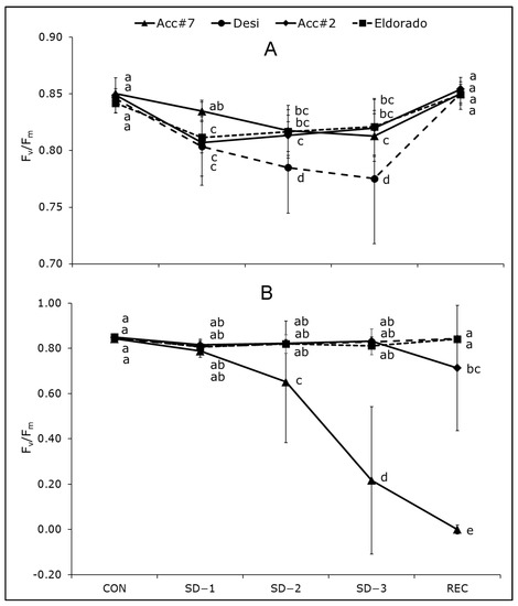 The Fv/Fm of all genotypes significantly decreased under cold stress (except for Acc#7 at SD-1) compared to control, on average by 5% in SD-3, but all genotypes did recover after cold stress (Figure 1A). Desi showed significantly the lowest Fv/Fm in SD-2 and SD-3 during cold stress compared to the other genotypes (Figure 1A). Under heat stress, Acc#7 had significantly lower Fv/Fm in SD-3 (74% reduction) compared to control, while the PSII efficiency of the other genotypes was maintained (Figure 1B). At recovery, Fv/Fm of Acc#7 and Acc#2 was significantly lower, by 100% and 16%, respectively, than the control, and Fv/Fm of Acc#7 was significantly the lowest compared to the other genotypes (Figure 1B).