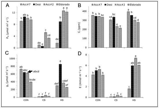(A) Net photosynthetic rate (PN), (B) intracellular CO2 (Ci), (C) stomatal conductance (gs) and (D) transpiration rate (E) in the second fully expanded top leaves of four chickpea genotypes under the treatments for 3 days. “CON”, 25/20 °C day/night; “CS”, 8/4 °C day/night; “HS”, 38/33 °C day/night. The data represent average values ± SD (n = 3). Different small letters above the bars indicate significant differences (p < 0.05). The arrow is indicating that the letters abcd belong to Acc#2 under control conditions.