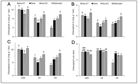 (A) Chlorophyll a (Chl. a), (B) chlorophyll b (Chl. b), (C) chlorophyll a+b (Chl. a+b) and (D) chlorophyll a:b ratio (Chl. a:b ratio) in the second fully expanded top leaves of four chickpea genotypes under the treatments for 3 days. “CON”, 25/20 °C day/night; “CS”, 8/4 °C day/night; “HS”, 38/33 °C day/night. The data represent average values ± SD (n = 3). Different small letters above the bars indicate significant differences (p < 0.05). The arrows are indicating that the letters abc belongs to Acc#7 and Desi at control conditions.