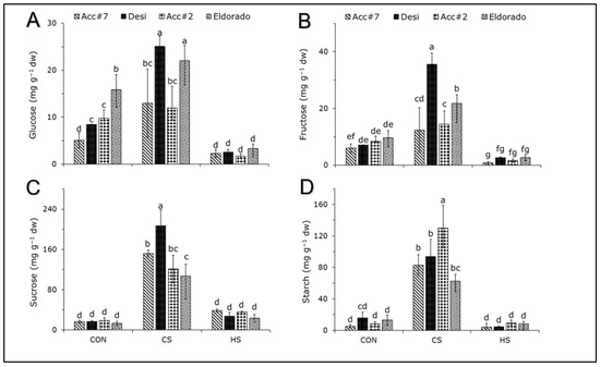 (A) Glucose, (B) fructose, (C) sucrose and (D) starch in the second fully expanded top leaves of four chickpea genotypes under the treatments for 3 days. “CON”, 25/20 °C day/night; “CS”, 8/4 °C day/night; “HS”, 38/33 °C day/night. The data represent average values ± SD (n = 3). Different small letters above the bars indicate significant differences (p < 0.05).