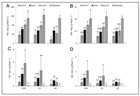 (A) Fresh weight vegetative (FW−Veg), (B) dry weight vegetative (DW−Veg), (C) fresh weight generative (FW−Gen) and (D) dry weight generative (DW−Gen) of four chickpea genotypes under the treatments for 3 days. “CON”, 25/20 °C day/night; “CS”, 8/4 °C day/night; “HS”, 38/33 °C day/night. The data represent average values ± SD (n = 4). Different small letters above the bars indicate significant differences (p < 0.05).