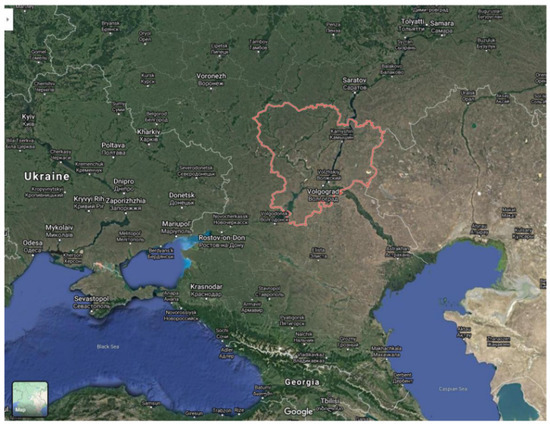 Volgograd region of the Russian Federation (administrative border highlighted in red). Satellite map (medium scale) from https://www.google.com/maps (accessed on 29 December 2021).