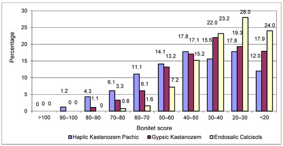 The number of taxonomic units of the Haplic Kastanozem Pachic with bonitet scores above 70 reaches 11.6%, Gypsic Kastanozem reaches 4.4%, and Endosalic Calcisols is only 0.8% (Figure 3). The bonitet scores of the Kastanozem type soil ranges from 20 to 40 points.