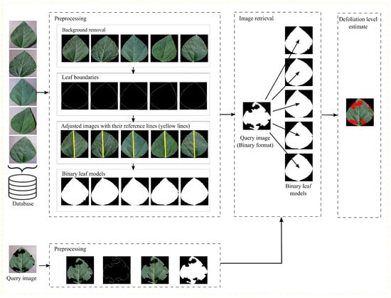 Our method is organized into three steps to handle background removal to highlight leaf regions, adjust images based on their geometric shape, and estimate defoliation severity. The adjusted images are used to prepare a database to retrieve leaf models similar to query images. Then, the retrieved images are used to estimate the percentage of damage in the query images. Figure 1 presents the flowchart of the method.