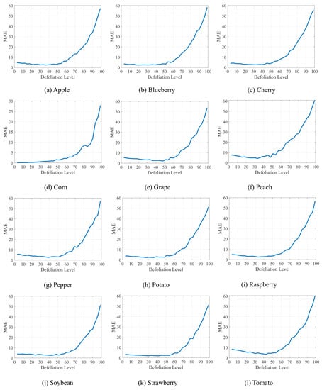 Additionally, we evaluate the proposal considering different defoliation levels. We consider a gradual increase in the defoliation level from which we apply progressive jumps of 3% until reaching 99% leaf damage. Figure 3 presents the outcomes where the best results occurred when the defoliation level was between 0% and 60%. Although the error increases after 60% defoliation, the error is still less than 50% even when the leaves are destroyed, such as after 90% defoliation. It is worth mentioning that this pattern is repeated in all plant species investigated in this study. In this way, it shows the generalization potential of the method.