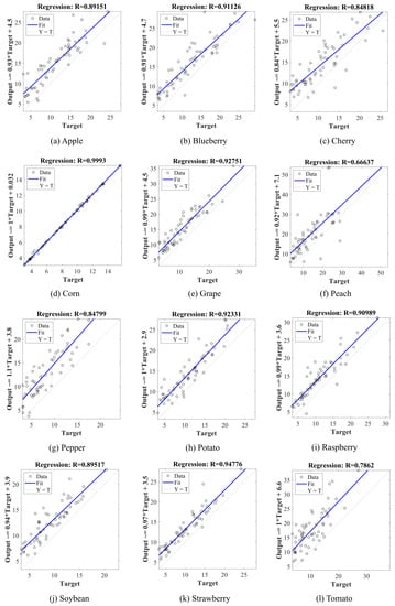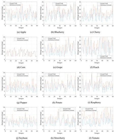 Figure 4 presents the scatter plot between the actual and estimated defoliation levels considering the correlation results of different plant leaves for the maximum defoliation level of 30%. The correlation coefficient above for apple, blueberry, cherry, corn, grape, bell pepper, potato, raspberry, soybean, and strawberry shows a positive linear correlation between the variables and indicates that the estimated damage closely follows the actual damage. In addition, a large part of the data is close to the regression line, which emphasizes the strong correlation between them. Since the fit line is above the reference line (Y = T), the estimated data are partially overestimated.
