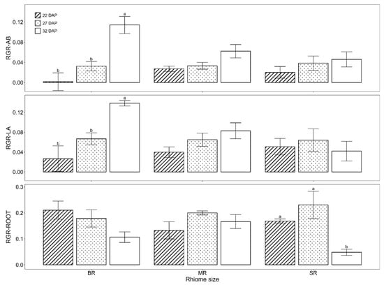 The relative growth rates of aboveground dry biomass, leaf area and total fibrous root length on 22, 27 and 32 DAP in EXP.1. Note: BR, MR and SR refer to the big, medium and small rhizome weight in EXP.1, respectively. The different lower-case letters indicate significant probability difference at p < 0.05 among sampling dates. The error bars represent standard errors (n = 3).