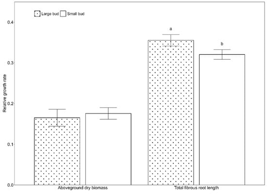 Section number did not influence the relative aboveground dry biomass growth rate in the period of 32 DAP to 46 DAP. However, the relative total fibrous root length growth rate was higher in LB treatment than in SB treatment (p < 0.05) (Figure 3).