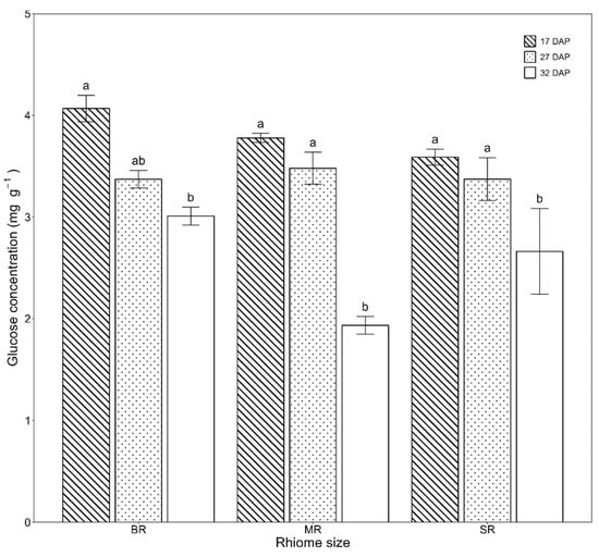 The glucose concentration in rhizomes on 17, 27 and 32 DAP in EXP.1. Note: BR, MR and SR refer to big, medium and small rhizome weight in EXP.1, respectively. The different lower-case letters indicate significant probability difference at p < 0.05 among sampling dates. The error bars represent standard errors (n = 3).
