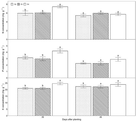 The N, P and K concentrations in leaves on 39 and 46 DAP in EXP.2. Note: S2, S3 and S4 refer to two equal sections, three equal sections and four equal sections, respectively in EXP.2. The different lower-case letters indicate significant probability difference at p < 0.05 among numbers of sectioning. The error bars represent standard errors (n = 3).