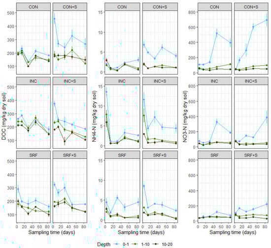 Dynamic of dissolved organic carbon (DOC) and mineral nitrogen forms (NH4-N, NO3-N) in CON (control), INC (straw incorporated in 0–10 cm soil layer) and SRF (straw applied at the soil surface) soil treatments in presence/absence of slurry (S) at three sampling depths (cm). Averages and standard errors of 4 replicates are shown.