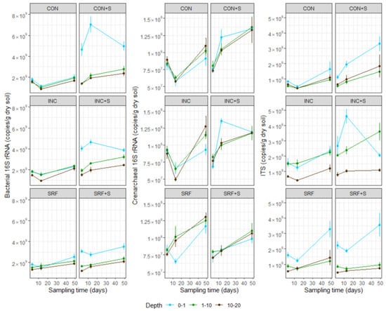 Dynamic of bacterial, crenarchaeal 16S rRNA and fungal ITS copy numbers in CON (control), INC (straw incorporated in 0–10 cm soil layer) and SRF (straw applied at the soil surface) soil treatments in presence/absence of slurry (S) at three sampling depths (cm). Averages and standard errors of 4 replicates are shown.
