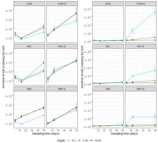 The abundance of bacterial amoA (AOB) and archaeal amoA (AOA) genes in soil (Table S4) were significantly affected mostly by depth and sampling time but less by treatment (Table S2). The depth response was more pronounced for AOB than for AOA, especially in the treatments with slurry fertilization (Figure 4). The slurry significantly increased AOA and AOB abundances (p < 0.0001), but this effect varied across the straw addition treatments. The differences in the abundance of AOA and AOB between treatments with and without slurry fertilization appeared at the second sampling time (day 13). AOA increased in all three depths in the INC and CON treatments but not in SRF. The abundance of AOB significantly increased in 0–1 cm and 1–10 cm soil layers in all treatments, with the greatest increase in the top 0–1 cm soil layer (Figure 4). When comparing sampling times, a decrease in AOA abundance was observed in CON and INC at all sampling depths on the 13th day of the experiment (2nd sampling point), while in SRF the abundance of these genes increased in the soil layers of 1–10 and 10–20 cm. In contrast, the abundance of AOB remained unaffected by straw addition. We also found that AOA amoA genes were more abundant than AOB. On average, the ratio of AOA to AOB ranged from 0.8 to 27.2, with the lowest ratios in the top 10 cm of slurry-fertilized soils (Table S7).