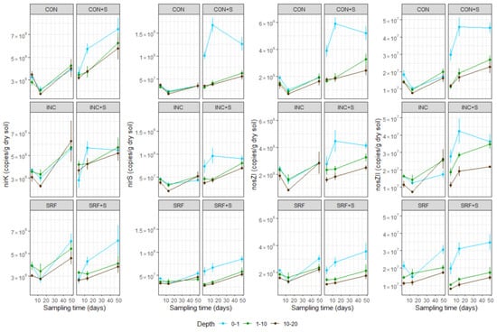 Dynamic of nirK, nirS, nosZI and nosZII gene abundance in CON (control), INC (straw incorporated in 0–10 cm soil layer) and SRF (straw applied at the soil surface) soil treatments in presence/absence of slurry (S) at three sampling depths (cm). Averages and standard errors of 4 replicates are shown.