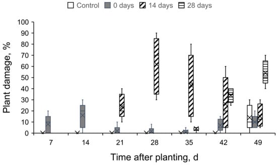 Damage in potatoes treated with S. alba extract at the time planting (0 days), 14 and 28 days after planting. Plant damage was calculated as a percentage of discoloured leaf area relative to the total area.