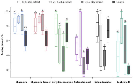 In addition to monitoring phenolics, potato glycoalkaloid content in potato tubers was measured. Glycoalkaloids are considered antinutrients as they are toxic to human and are generally undesirable [42,47]. At the same time, it has been shown that low concentrations of glycoalkaloid can exhibit anticancer activity [48]. The concentration of α-solanine, one of the major glycoalkaloids in potatoes, was not significantly different in the potatoes treated with S. alba extract compared to the control untreated potatoes. At the same time, concentrations of α-chaconine, another major glycoalkaloid, were statistically higher in potatoes after S. alba extract treatment but were not different for the three S. alba extract application rates. Still, the concentrations of α-chaconine were far below the established health-based maximum levels for human consumption [49]. The observed changes in other glycoalkaloids indicate that changes induced by S. alba extract are glycoalkaloid chemistry dependent.