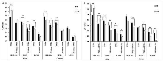 Ct value in HLB-affected citrus cuttings treated with heat and chemical treatment via PMA-qPCR using three different primer sets. (A) Heat treatment at temperature 60 °C; (B) Amp treatment (3000 ppm). Significant differences between different time points are indicated by * p ≤ 0.05 and ** p ≤ 0.01. Standard error of the mean is indicated by a vertical line. HLB-16S, RNR, and LJ900 indicate primer sets HLBas/HLBr, RNRf/RNRr and LJ900f/LJ900r, respectively.