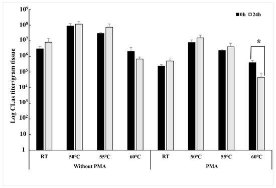 In this study, the variance analysis indicated that there were significant differences in CLas titers between the samples pre-treated with PMA and the untreated samples (p = 0.0015). The comparison of the different temperatures used indicated that there were significant differences in the CLas titers between the temperature treatments (p = 0.0001). In the PMA treatment, the CLas titers were significantly reduced after exposure to 60 °C for 24 h as compared to the pre-treatment level (p = 0.0165) (Figure 2), while no significant differences were detected after exposure for 24 h at room temperature (23 ± 0.2 °C), 50 °C, and 55 °C treatments. Without PMA treatment, there were no significant differences in the CLas titers at all the temperature treatments after 24 h exposure (Figure 2), including treatment at 60 °C, which showed a small reduction in titers although it was not significant (p = 0.1274).