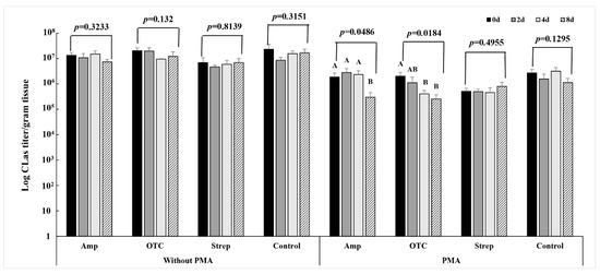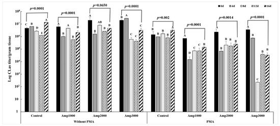 Our results indicated that in the qPCR performed on DNA pre-treated with PMA, the CLas titer at different concentrations (0, 1000 ppm, 2000 ppm, and 3000 ppm) were significantly lower, compared to without PMA treatment (Figure 3, Table S3). For the PMA-treated and untreated samples, both the Amp concentration (p = 0.0001) and time point (p = 0.0001) had a significant effect on the CLas titers. In the PMA treatment, the CLas titer was significantly reduced by Amp at 1000 ppm, 2000 ppm, and 3000 ppm from 4 days after initial treatment (Figure 3). In contrast, there were no significant differences in the CLas titer between the different time points under water treatment. In the three ampicillin concentrations used, the CLas titers were reduced starting at 4 days and reaching a maximum reduction at 8 days after initial treatment. Therefore, 8 days after chemical treatment was the optimal time point for assessing the CLas titers using PMA-qPCR.
