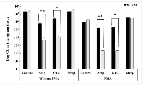 In the HLB-affected citrus cuttings, the CLas titers were significantly reduced by Amp and OTC, in both the PMA (Amp p = 0.0015, OTC p = 0.0261) and without PMA treatments (Amp p = 0.0036, OTC p = 0.0211) (Figure 4 and Table S4). In contrast, there were no significant differences in the CLas titers after Strep treatment, as well as after the water control treatments (Figure 4).
