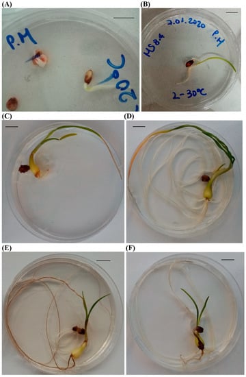 (A) In vitro seed germination of Pancratium maritimum at 20 °C after 8 days, (B) seedlings at the stage of one leaf—20 days after the establishment of seeds in vitro, (C) seedling-bulblet development in culture medium with sucrose 40 g/L at 10 °C after 72 days, (D) seedling-bulblet development in culture medium with sucrose 40 g/L at 30 °C after 72 days, (E) seedling-bulblet development in culture medium with sucrose 80 g/L at 20 °C after 72 days, (F) seedling-bulblet development in culture medium with sucrose 80 g/L at 30 °C after 72 days. Bars = 10 mm.