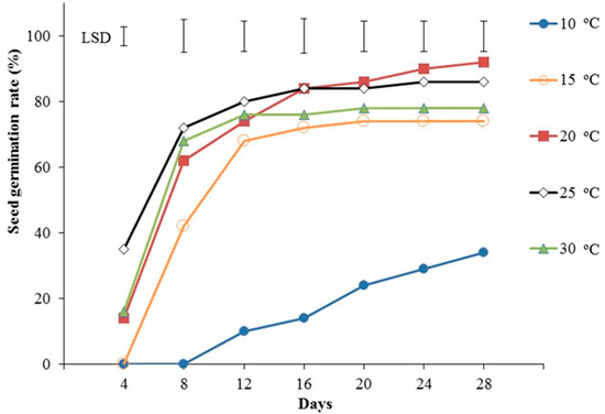 Five seeds were placed in each Petri dish, and four replicates of twenty-five seeds each (i.e., five Petri dishes per replicate) were used for each temperature tested. The Petri dishes were placed in incubation chambers at 10 °C, 15 °C, 20 °C, 25 °C, and 30 °C under complete dark conditions. Measurements were taken daily for 28 days, and the results are presented at 4-day intervals. Germination was considered to occur when the length of the radicle was at least 2 mm.