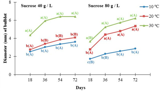The diameter of the bulblet was significantly affected by both temperature and sucrose concentration in the culture medium, as shown in Figure 4. In the case of medium with a sucrose concentration of 40 g/L, microplants produced bulblets with a statistically significant higher diameter at 30 °C (6.4 mm on average) compared to 20 °C (4.1 mm on average) and 10 °C (3.6 mm on average). Similar results were recorded in the case of medium with the highest sucrose content (80 g/L), although no significant difference between 20 °C (5.4 mm on average) and 30 °C (6.2 mm on average) was detected. Moreover, when we compared the response of the microplants at 30 °C, no differences were observed in the diameter of the bulbs regardless of the sucrose concentration of the growing medium (40 or 80 g/L), whereas contrasting effects were observed at 20 °C and 10 °C, especially after 72 days of the experiment’s initiation.