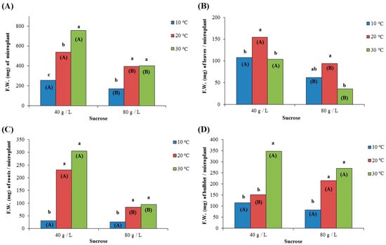 Effect of two different concentrations of sucrose (40 g/L and 80 g/L) at three different temperatures (10 °C, 20 °C, and 30 °C) on the fresh weight (F.W. expressed mg) of (A) microplant; (B) leaves per microplant; (C) roots per microplant; and (D) bulblet per microplant, after growing for 72 days in culture medium. In each sucrose concentration, the same lowercase letters indicate non-statistically significant differences among the temperature treatments, according to the LSD test (p ≤ 0.05). In each temperature, the same uppercase letters in parenthesis indicate no statistically significant differences between sucrose concentrations, according to Student’s t-test (p ≤ 0.05).