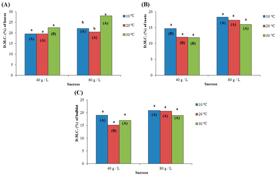 Effect of two different concentrations of sucrose (40 g/L and 80 g/L) at three different temperatures (10 °C, 20 °C, and 30 °C) on the dry matter content (D.M.C. expressed as %) of (A) leaves, (B) roots and (C) bulblet, after growing for 72 days in culture media. In each sucrose concentration, the same lowercase letters indicate non-statistically significant differences among the temperature treatments, according to the LSD test (p ≤ 0.05). In each temperature, the same uppercase letters in parenthesis indicate no statistically significant differences between sucrose concentrations, according to Student’s t-test (p ≤ 0.05).