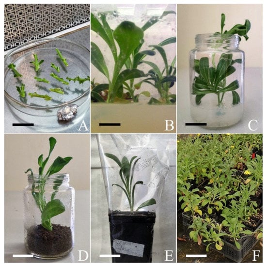 In vitro procedure for C. maritima plant regeneration from nodal explants. (A) Mono and binodal explants used for in vitro introduction (bar: 1 cm). (B) In vitro shoot regeneration obtained on MS medium after 30 days of culture (bar: 1 cm). (C) In vitro rooting obtained on MS medium after 30 days of culture (bar: 2.5 cm). (D) In vitro rooting obtained on Zeolite after 30 days of culture (bar: 2.5 cm). (E) Acclimatization phase (bar: 3.5 cm). (F) In vitro regenerated plantlets of C. maritima acclimatized in outdoor conditions after 30 days from transfer in outdoor conditions (bar: 7 cm).
