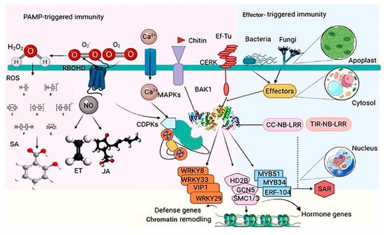 The first step in the immune response is PTI. PAMPs or MAMPs are identified by PRRs and conserved molecular patterns such as lipopolysaccharides, peptidoglycans, chitin, flagellin, EF-Tu, DNA, and ergosterol. The production of ROS, the activation of MAP kinase, and the stimulation of pathogen-responsive gene transcription are some of the well-known MAMP evaluations included in the activation of signaling pathways and hydrolysis [43,44].