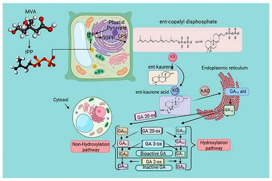 GA is a tetracyclic diterpenoid belonging to the gibberellin family. It is involved in plant growth, metabolism, and response to abiotic stress [52]. The biosynthetic pathways of GA have been extensively investigated [64]. Ent-copalyl diphosphate synthase, ent-kaurene synthase, ent-kaurene oxidase, ent-kaurenoic acid oxidase, GA13-oxidase, GA20-oxidase (GA20ox), GA3-oxidase (GA3ox), and GA2-oxidase are enzymes essential for GA biosynthesis [65]. Geranylgeranyl diphosphate is converted into the endogen ent-kaurene by ent-copalyl diphosphate synthase and ent-kaurene synthase in plastids. In the endoplasmic reticulum, GA12-aldehyde is formed by ent-kaurene oxidation.