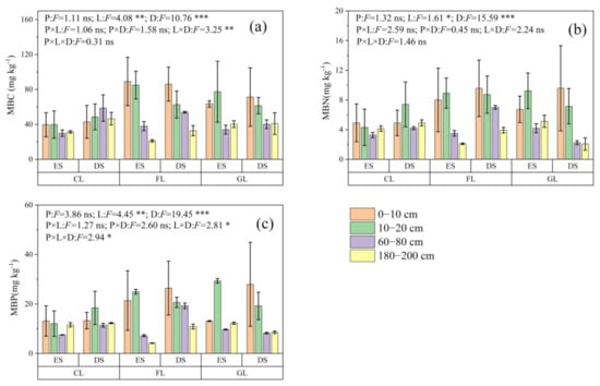 (a) Microbial biomass carbon (C), (b) nitrogen (N), and (c) phosphorous (P) from different soil sites. MBC: microbial biomass carbon; MBN: microbial biomass nitrogen; MBP: microbial biomass phosphorous. CL: cropland; FL: forestland; GL: grassland; ES: eroded site; DS: deposited site. Values are expressed as the mean ± standard error. P: landform position; L: land use type; D: soil depth. ***, **, * mean the significant differences at p < 0.001, p < 0.01, and p < 0.05, respectively, and ns means no significant differences (p > 0.05).