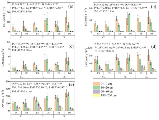 Soil microbial enzymatic activity of (a) CBH, (b) BG, (c) NAG, (d) LAP, and (e) AP from different soil sites. CBH: β-d-cellobiosidase; BG: β-1,4-glucosidase; NAG: β-1,4-N-acetylglucosaminidase; LAP: leucine aminopeptidase; AP: alkaline phosphatase. CL: cropland; FL: forestland; GL: grassland; ES: eroded site; DS: deposited site. Values are expressed as the mean ± standard error. P: landform position; L: land use type; D: soil depth. ***, **, * mean the significant differences at p < 0.001, p < 0.01 and p < 0.05, respectively, and ns means no significant differences (p > 0.05).