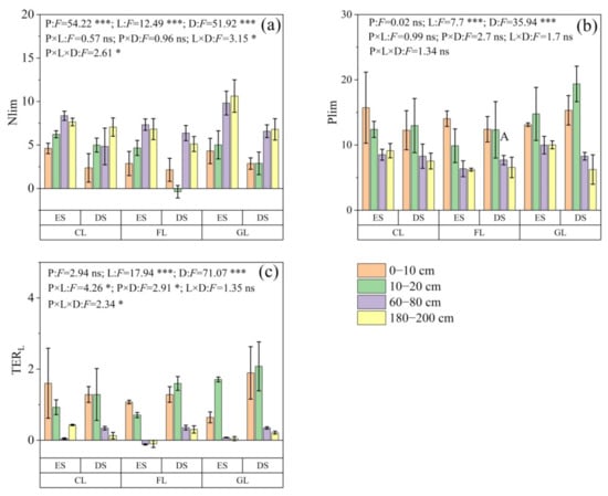 (a) Microbial N limitation, (b) microbial P limitation and (c) Threshold elemental ratio (TERL) from different soil sites. CL: cropland; FL: forestland; GL: grassland; ES: eroded site; DS: deposited site. Different capital letters represent significant difference (p < 0.05) between different landform positions in the same land use type and soil depth. Values are expressed as the mean ± standard error. P: landform position; L: land use type; D: soil depth. ***, * mean the significant differences at p < 0.001 and p < 0.05, respectively, and ns means no significant differences (p > 0.05).
