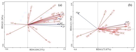 The redundancy analysis (RDA) was used to identify the (a) relationship between enzyme activities and soil physicochemical and microbial properties and (b) the relationship between microbial nutrient limitations and soil physicochemical and microbial properties. SM: soil moisture; OC: soil organic carbon; TN: total nitrogen; TP: total phosphorus; MBC: microbial carbon; MBN: microbial nitrogen; MBP: microbial phosphorus; DOC: dissolved organic carbon; EP: soil available phosphorus; NO3−: nitrate nitrogen; NH4+: ammonia nitrogen; Nlim: microbial N limitation; Plim: microbial P limitation.