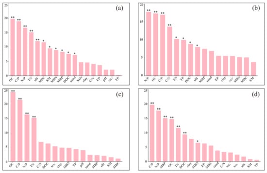 The Random Forest model (RF) was used to determine the key factors affecting (a) soil extracellular enzymatic activity, (b) soil microbial N limitation, (c) P limitation, and (d) Threshold elemental ratio (TERL). SM: soil moisture; OC: soil organic carbon; TN: total nitrogen; TP: total phosphorus; DOC: dissolved organic carbon; EP: soil available phosphorus; NO3−: nitrate nitrogen; NH4+: ammonia nitrogen. **, * mean the significant differences at p < 0.01 and p < 0.05, respectively.