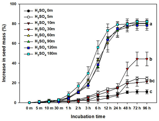 Effects of sulfuric acid scarification times on the increase in mass of Hovenia dulcis seeds. Seeds were scarified with 98% sulfuric acid at room temperature (20–25 °C). Vertical bars show ± SE of three replicates. The different letters represent statistically significant differences for germination percentages according to treatments in 96 h as determined by Duncan’s multiple range test (p < 0.05).