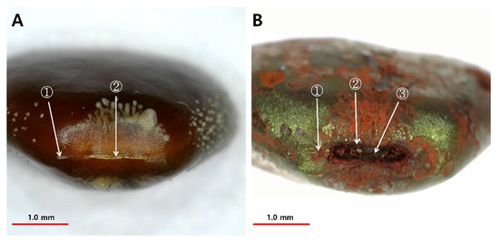Water gap opening of Hovenia dulcis seeds after 24 h in water after (A) no treatment and (B) sulfuric acid treatment for 1 h. Arrows ①, ②, and ③ indicate micropyle, hilum, and hilar fissure, respectively.