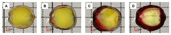 Time periods of water absorption by Hovenia dulcis seeds after sulfuric acid scarification for 1 h at (A) 0, (B) 1, (C) 12, and (D) 24 h. Dyeing was performed using safranin stain. Arrows indicate hilar fissure.