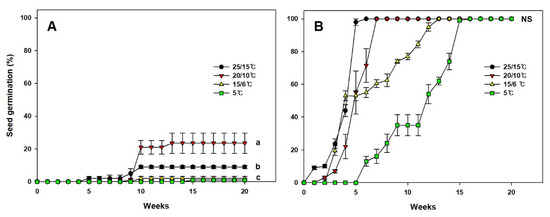 Germination of Hovenia dulcis seeds at various temperature regimes after (A) no treatment and (B) 98% sulfuric acid scarification for 1 h. Vertical bars show ± SE of four replicates. The different letters represent statistically significant differences for germination percentages according to treatments in the 20th week as determined by Duncan’s multiple range test (p < 0.05).