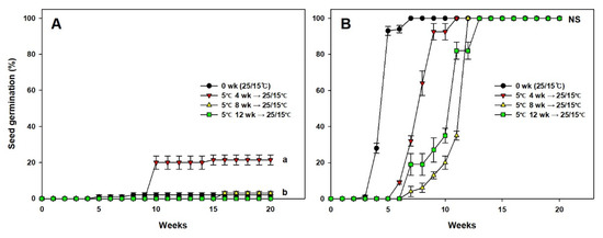 When cold stratification treatment was performed without scarification, only approximately 20% of the seeds germinated, regardless of the period of cold stratification treatment (Figure 5A). However, all seeds germinated after scarification, regardless of the cold stratification period (Figure 5B). The scarified seeds that were not subjected to the cold stratification treatment achieved the fastest germination, and the increase in the cold stratification treatment period increased the time required to reach final germination.