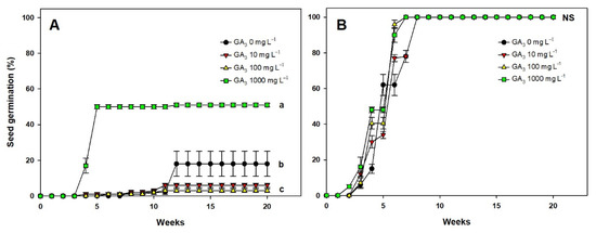 Germination of Hovenia dulcis seeds with gibberellic acid treatment after (A) no scarification and (B) 98% sulfuric acid scarification for 1 h. Vertical bars show ± SE of four replicates. The different letters represent statistically significant differences for germination percentages according to treatments in the 20th week as determined by Duncan’s multiple range test (p < 0.05).