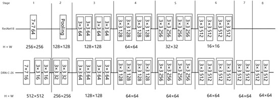 A comparison of ResNet18 and DRN-C-26. Each rectangle in the figure represents a Conv-BN-ReLU combination. The number in the rectangle indicates the size of the convolution kernel and the number of output channels. H × W indicates the height and width of the feature map.