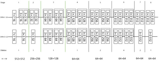 To ensure the model’s real-time performance, DRN-C-26 needs to be simplified. DRN-D-22 is a simplified version of DRN-C-26 and is shown in Figure 2. Compared with DRN-C-26, in DRN-D-22, the 1st, 2nd, 7th, and 8th stages remove a Conv-BN-ReLU combination and residual connection, which simplifies the model structure and reduces the computational overhead. In this paper, DRN-D-22 is used as the feature extraction network for DeepLabv3+.