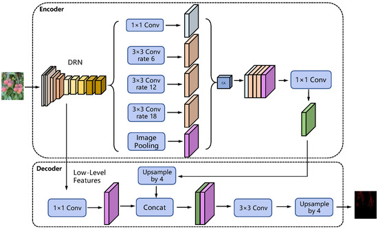 Inspired by the encoder-decoder structure, the DeepLabv3+ [14] network adds a simple decoder structure to DeepLabv3; this structure is used to recover the target objects’ boundary information. The DeepLabv3+ network is divided into an encoder and a decoder. The encoder consists of a backbone feature extraction network and an atrous spatial pyramid pooling module. The feature extraction network in the classical DeepLabv3+ network is Xception. The atrous spatial pyramid pooling module includes five branches, which include a 1 × 1 convolution and three 3 × 3 dilated convolutions with dilated rates of 6, 12, and 18, which can obtain rich contextual information. In the decoder, the multi-scale semantic feature maps obtained from the atrous spatial pyramid pooling module are upsampled by a factor of 4, and the features are then fused with the low-level semantic information extracted from the backbone network. After a 3 × 3 convolution, upsampling is performed by a factor of 4 to obtain the semantic segmentation result.