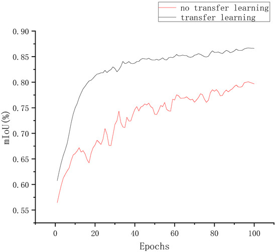 The results of the DeepLabv3+ model segmentation comparison experiments for the DRN-D-22 backbone network with and without transfer learning are shown in Table 1, and the mIoU chart is shown in Figure 5. Without transfer learning, the mIoU results are unstable and there are large fluctuations. After the 60th epoch, the mIoU gradually increased steadily and reached 80.15%, while the mPA reached 84.50%. The experiments were conducted under transfer learning conditions, and as shown in Figure 5, the DRN has a relatively good feature extraction capability at the beginning due to the transfer of a large amount of knowledge from the ImageNet dataset to the dataset introduced in this paper. During the first 33 epochs, the mIoU was in a phase of rapid growth. During the subsequent epochs, the mIoU tended to increase steadily, reaching 86.72%. The mPA reached 91.31%. Compared with the case without transfer learning, the mIoU and mPA improved by 6.57% and 6.81%, respectively.