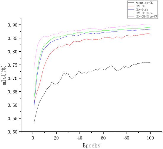 This section describes the ablation experiment we conducted using the DeepLabv3+ model. Xception-CE indicates the DeepLabv3+ model using Aligned Xception as the backbone network and CE as the loss function, that is, the classical DeepLabv3+ model. DRN-CE and DRN-Dice represent DeepLabv3+ models that used DRN-D-22 as the backbone network, and the loss functions are CE and Dice Loss, respectively. DRN-CE-Dice represents the DeepLabv3+ model that used DRN-D-22 as the backbone network and combined CE and Dice Loss into a loss function. DRN-CE-Dice-CA represents the addition of the CA module to DRN-CE-Dice. The mIoU chart is shown in Figure 6, and the model performance evaluation is shown in Table 2. In Table 2, “√” indicates that the marked module is used in the experiment, and no “√” indicates that this module is not added.
