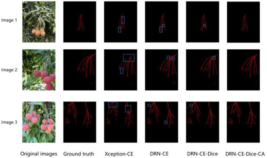 As can be seen from Figure 7, Xception-CE found multiple branches that are not segmented completely, as shown in the blue box, and the segmentation is poor. DRN-CE and DRN-CE-Dice produced some incomplete segmentation, as shown in the blue box. On the whole, the segmentation effect of DRN-CE-DICE is better than that of DRN-CE. The areas not segmented by DRN-CE-Dice were segmented completely by DRN-CE-Dice-CA, and overall, DRN-CE-Dice-CA more completely segmented whole litchi branches.